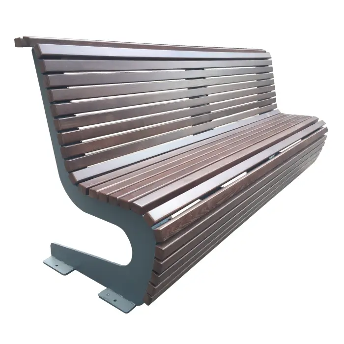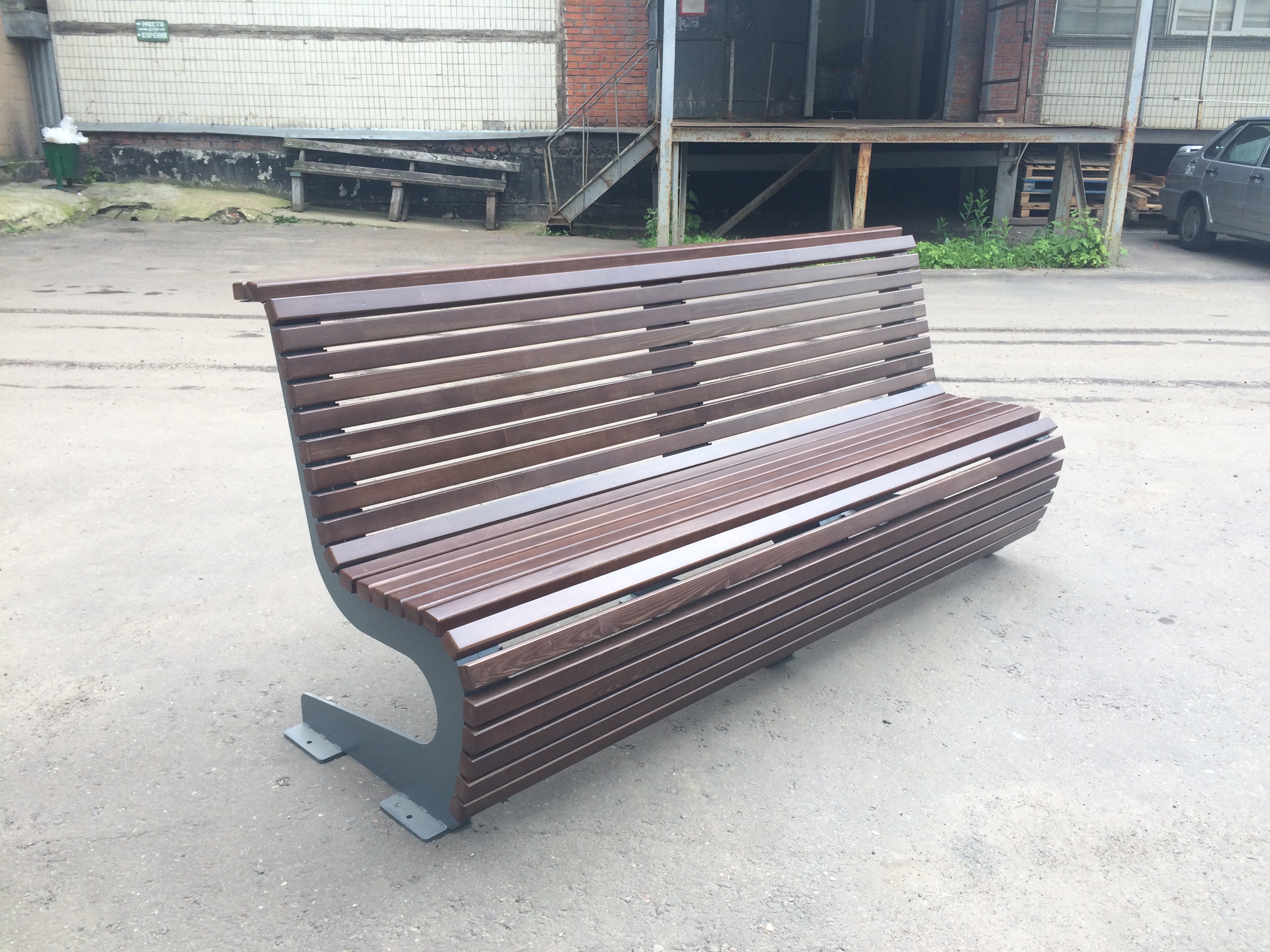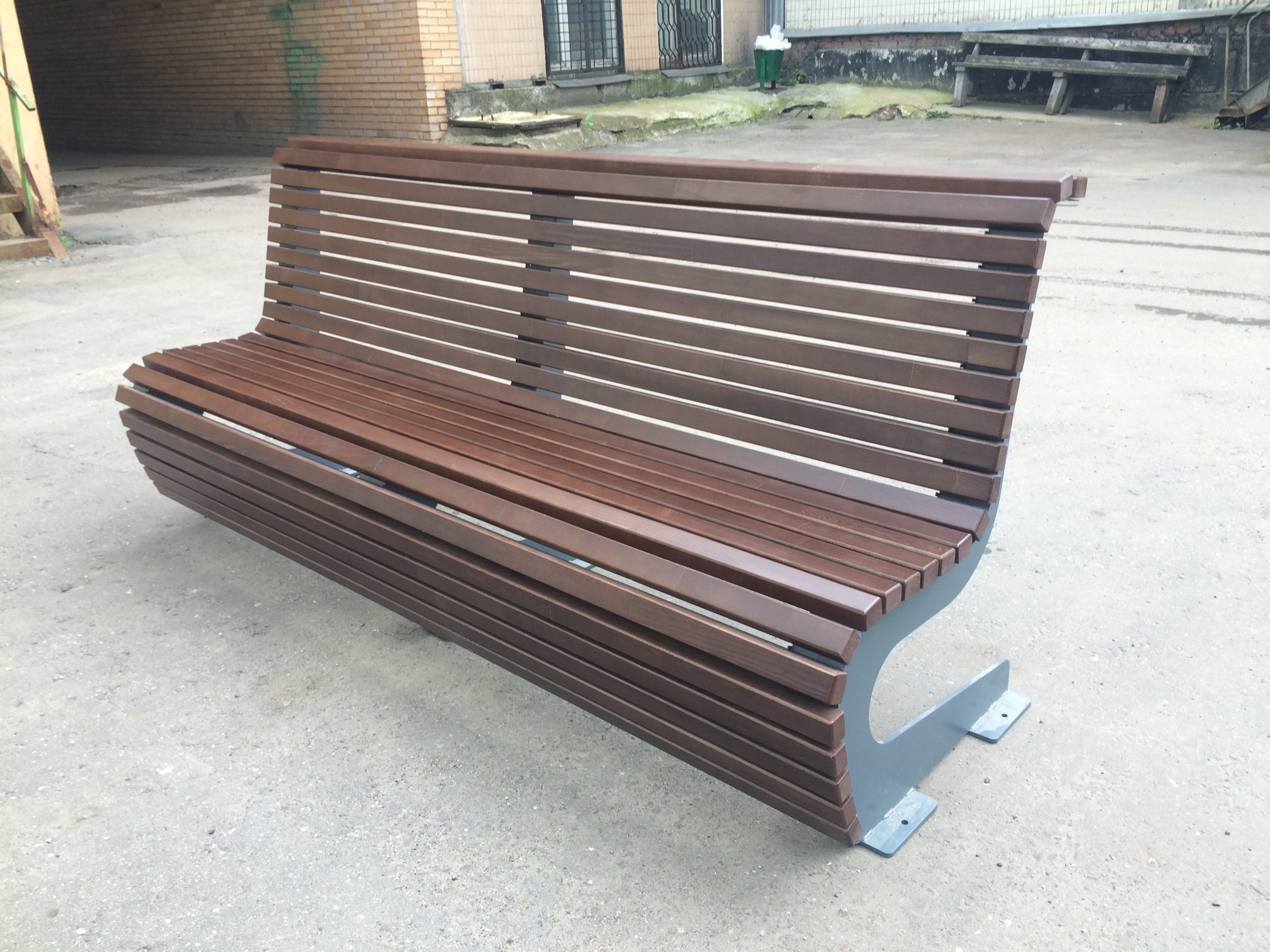Сиденье и спинка набраны из хвойного бруса 60×40 мм, пропитанного антисептическими составами и покрытого глянцевым лаком, базовый цвет — Палисандр с возможностью выбора другого оттенка из палитры. Три опоры по длине скамейки жёстко фиксируют брус и позволяют выдерживать нагрузку более 400 кг без деформации.