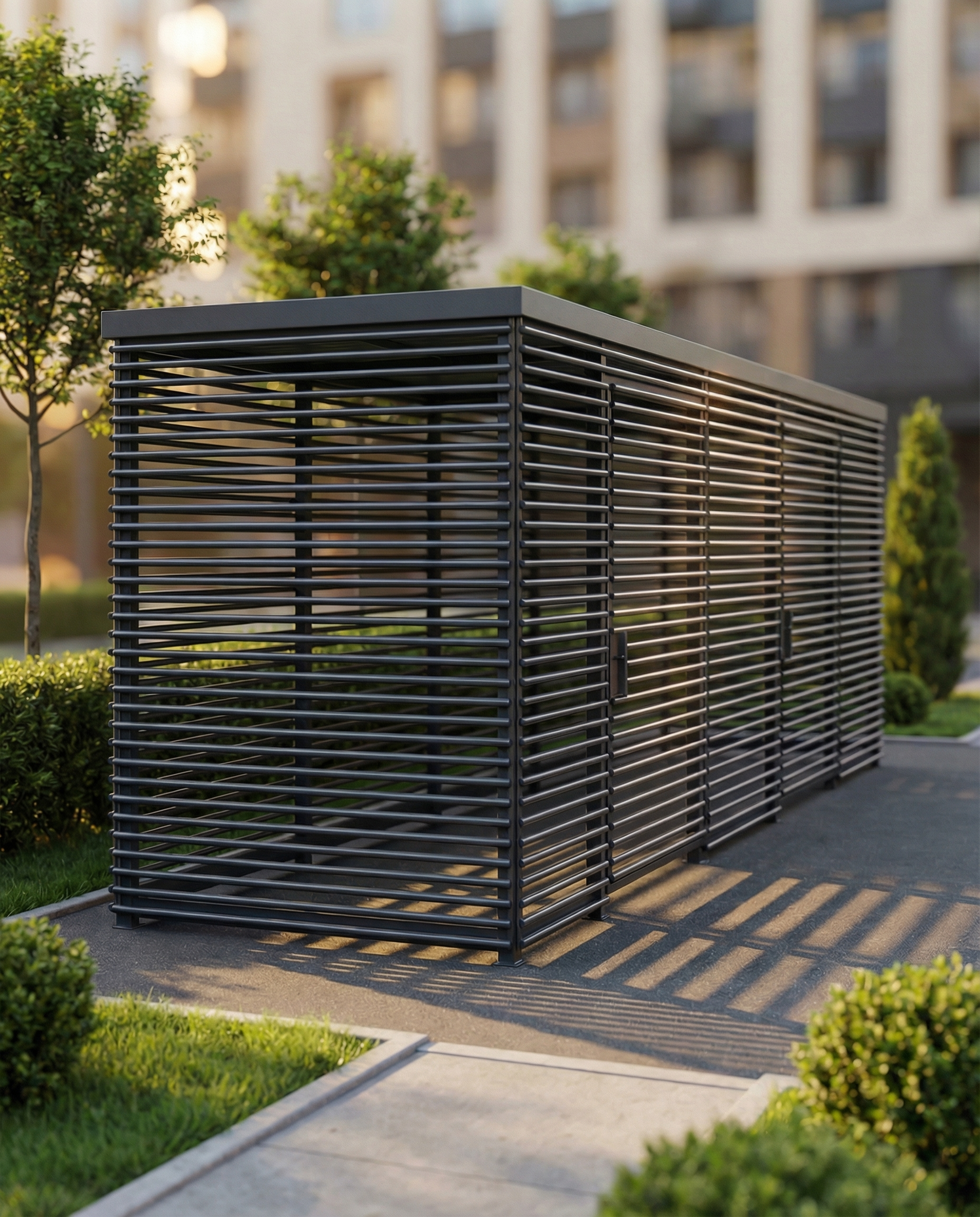 Базовый размер изделия — 1500×2000×2250 мм, чего достаточно для нескольких стандартных контейнеров; каждый дополнительный погонный метр добавляется из расчёта 60 000 руб., при этом общая длина может достигать 15 м — решение подходит как для компактных дворов, так и для крупных ЖК и муниципальных объектов.