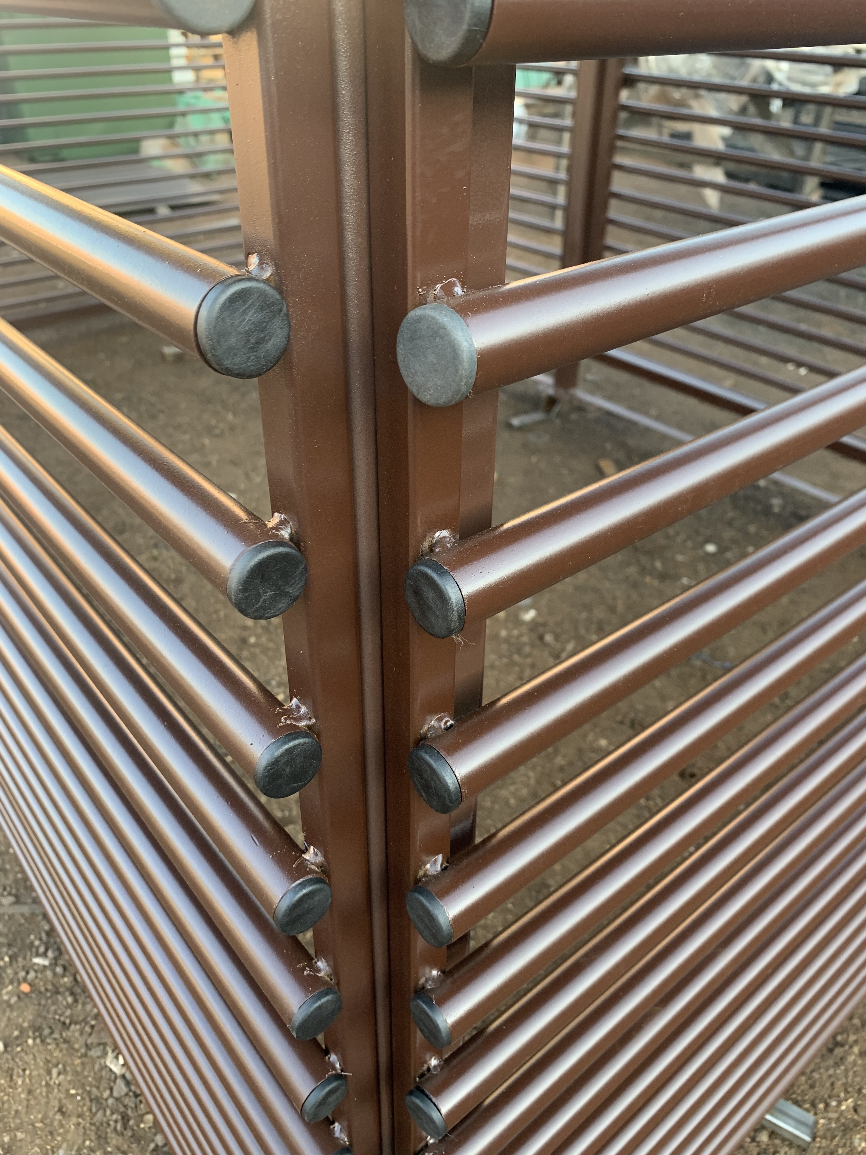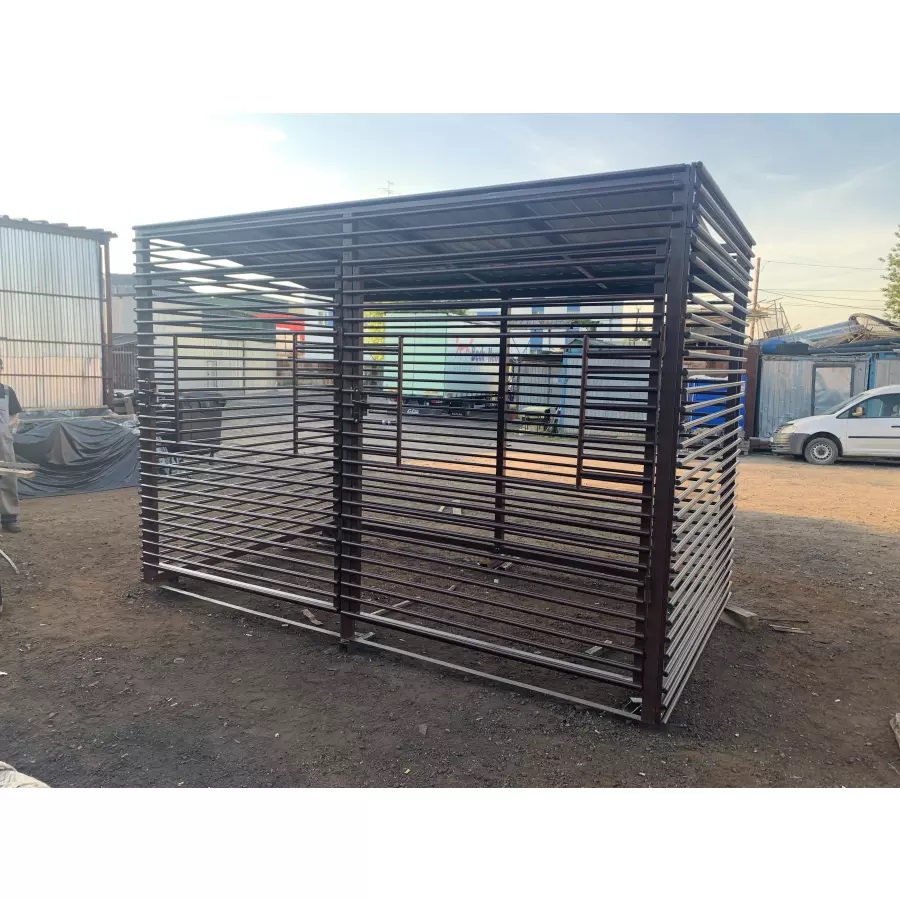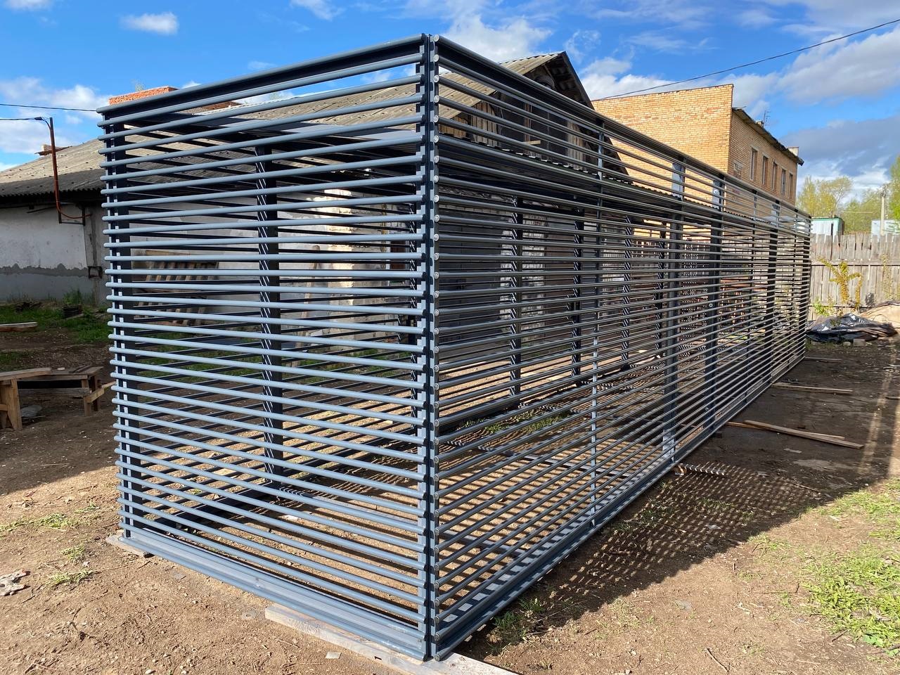 Каркас площадки сварен из профильной трубы 60×60 мм, обшивка выполнена из цельносварных декоративных элементов на основе трубы 20×20 мм и круглой 25 мм — такая конструкция держит форму при ежедневных нагрузках, ударах контейнеров и снеговой нагрузке на крышу.