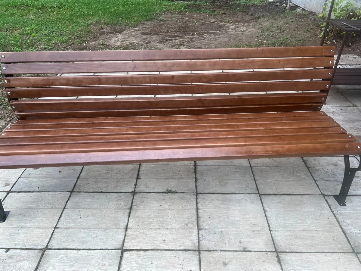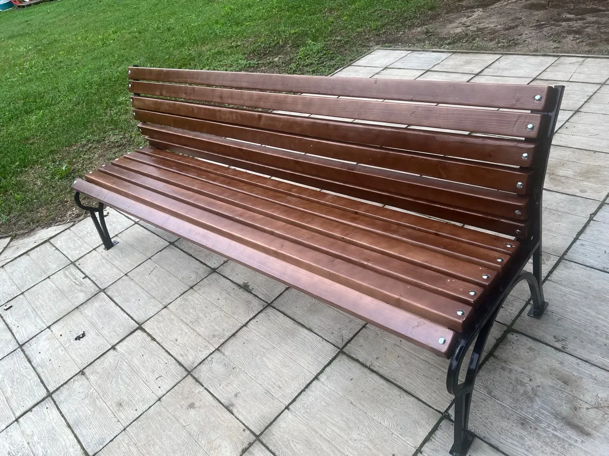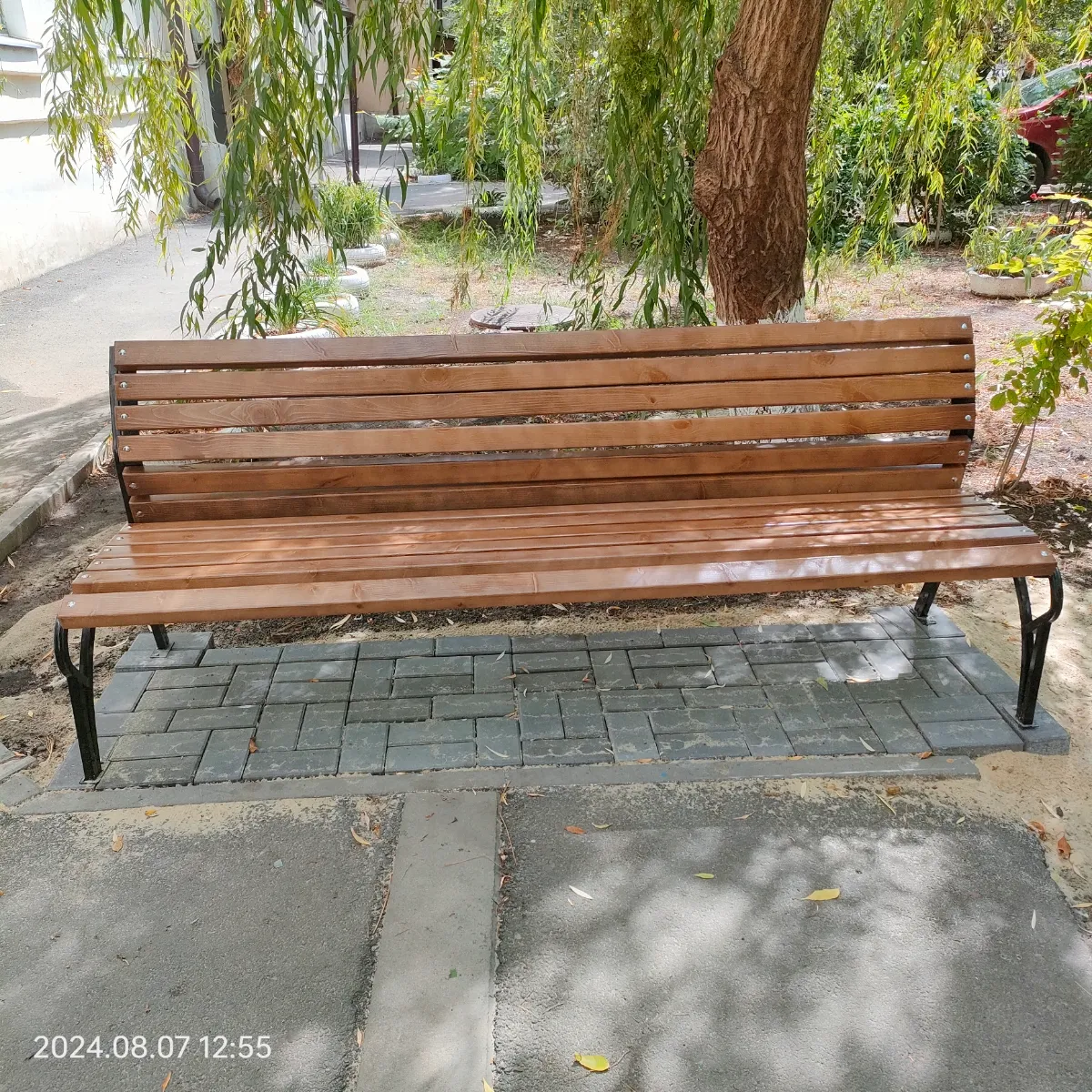 Сиденье и спинка выполнены из хвойного бруса 60×40 мм, обработанного антисептиками и тонирующими пропитками — скамейка выглядит тёплой и аккуратной, при этом сохраняет внешний вид долгие годы. Продуманная высота сиденья (44 см), спинки (84 см) и ширина 56 см обеспечивают комфортную посадку для взрослых и детей. Вес 37 кг делает скамейку устойчивой, но удобной для монтажа.