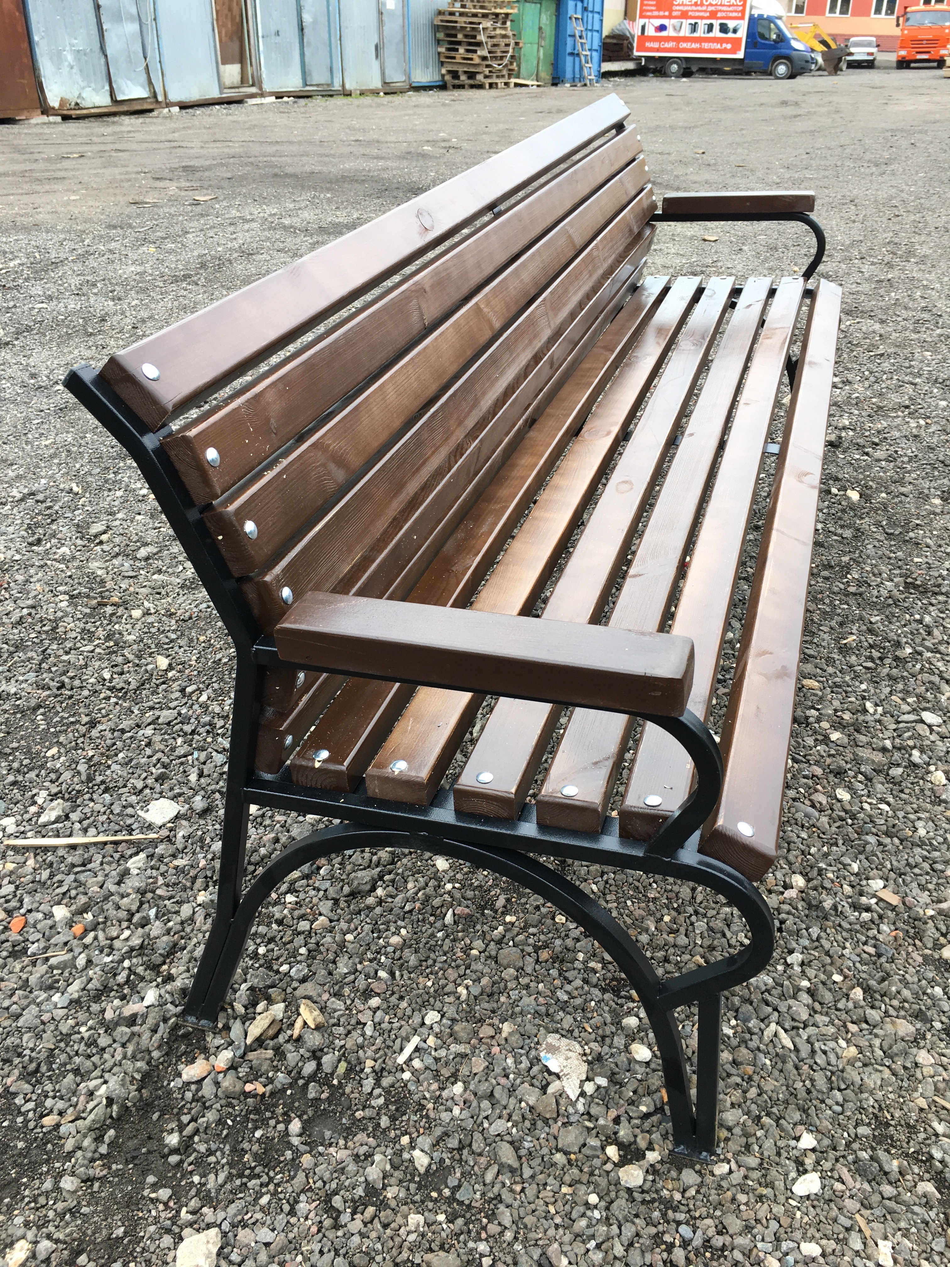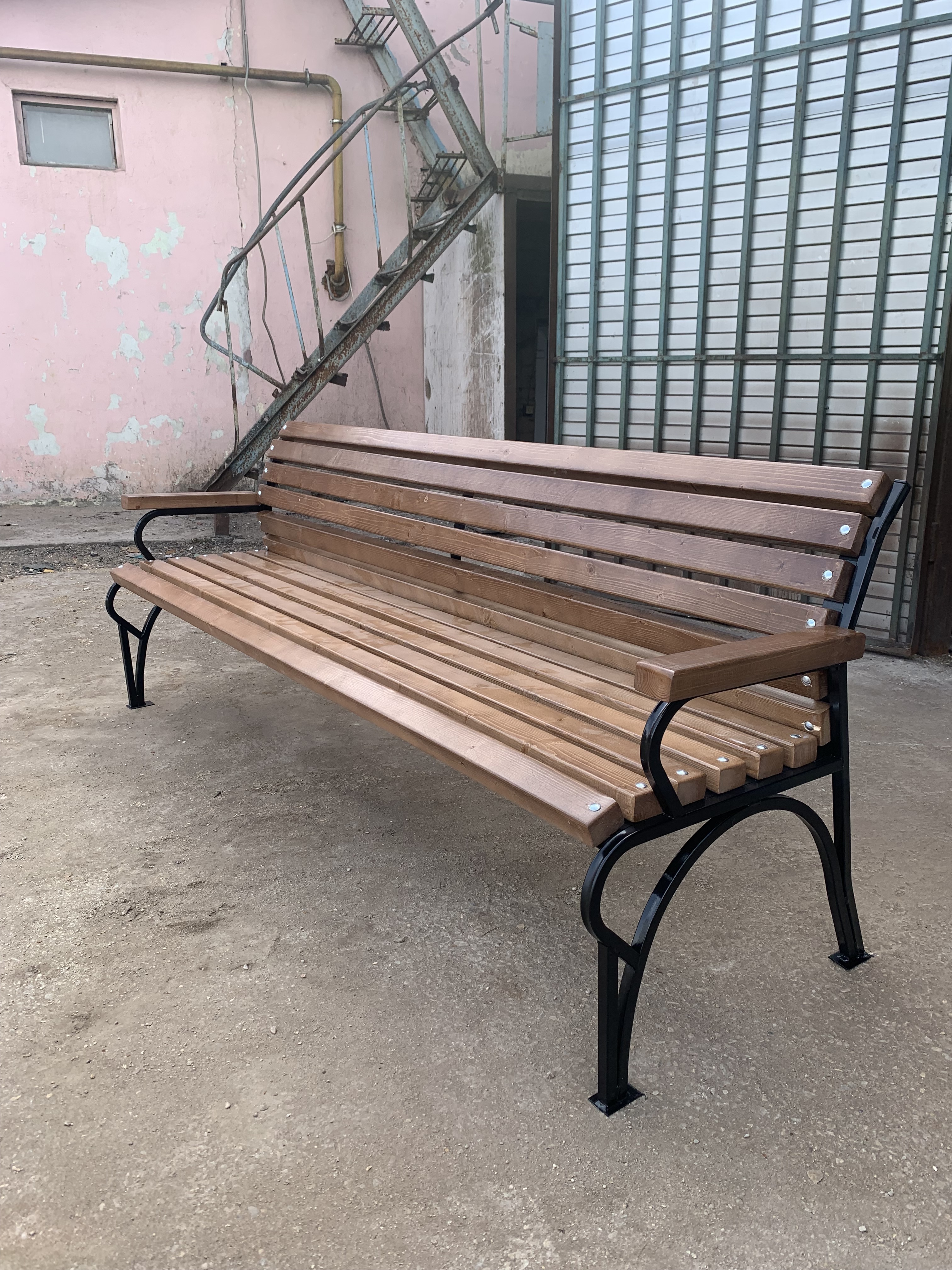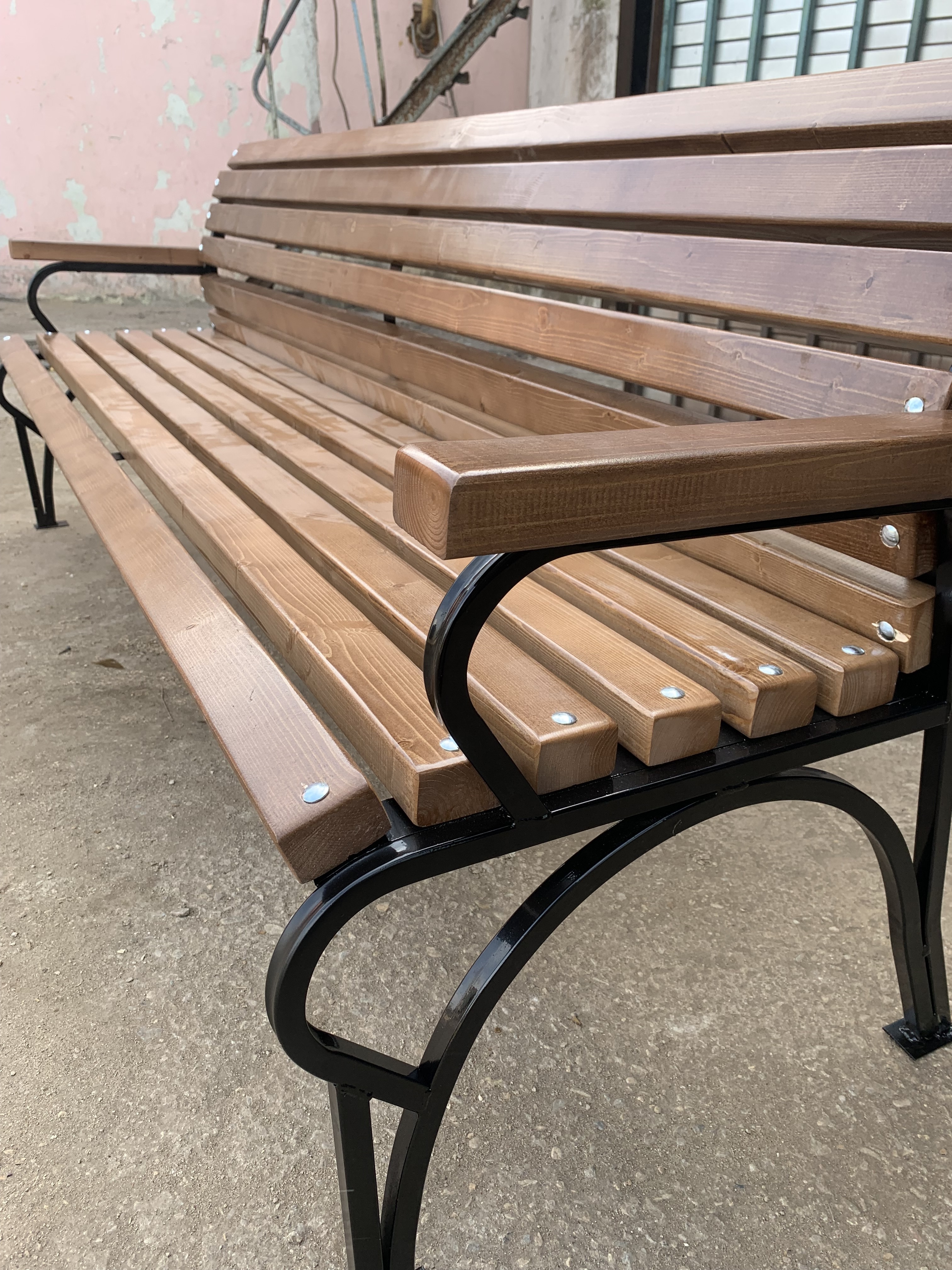 Каркас выполнен из профильной трубы 20×20 мм, что даёт жёсткость и устойчивость конструкции, а аккуратные подлокотники обеспечивают дополнительный комфорт при посадке и вставании. Сиденье и спинка собраны из качественных деревянных ламелей, обработанных антисептическими и тонирующими составами, поэтому скамейка выглядит тепло и «по‑домашнему», при этом рассчитана на уличную эксплуатацию.